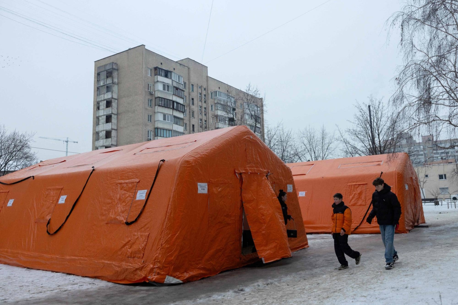 Os bombardeios russos contra o sistema energético da Ucrânia se intensificaram desde o início da invasão em 2022. Em resposta à crise, foram montadas tendas de apoio em diversas partes da cidade, onde os moradores podem se aquecer e carregar dispositivos eletrônicos essenciais, como celulares e lanternas.